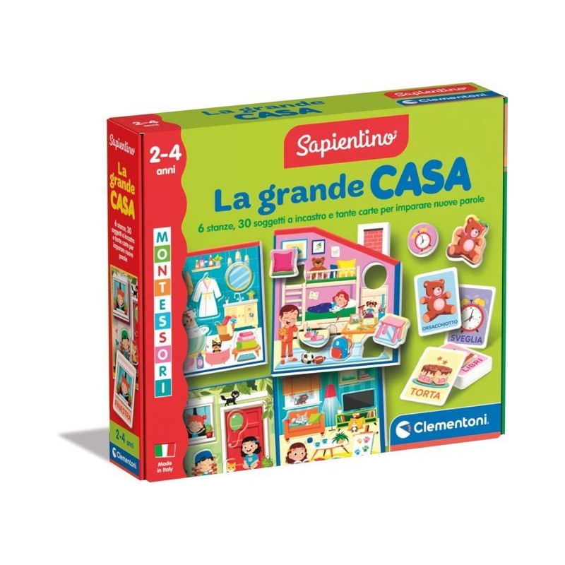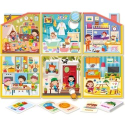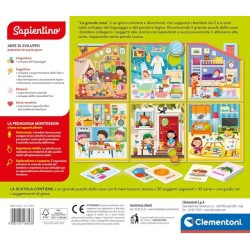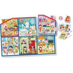 La confezione contiene un grande puzzle casetta con 6 stanze in cui incastrare 30 oggetti sagomati