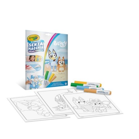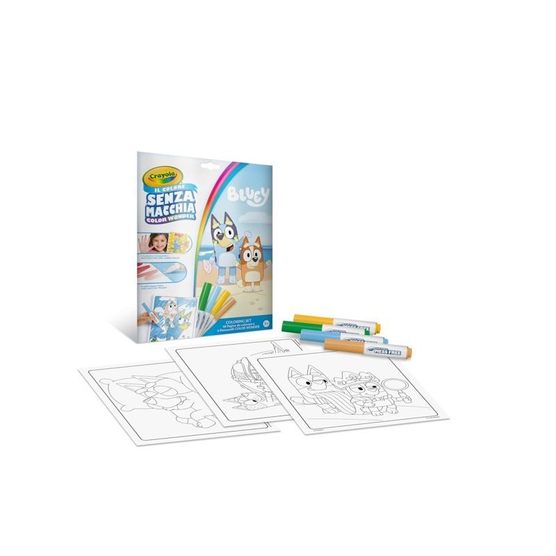 Il Coloring Set Color Wonder contiene 18 pagine da colorare tematizzate con con le avventure di Bluey e della sua famiglia e 4 pennarelli SENZA MACCHIA Color Wonder L inchiostro è trasparente e non macchia pelle mobili o tessuti perché il colore appare solo sulla carta speciale Color Wonder e da nessun altra parte Passando il pennarello sulla carta appaiono anche dei disegni nascosti Il set contiene 18 pagine da colorare 4 pennarelli SENZA MACCHIA Color Wonder