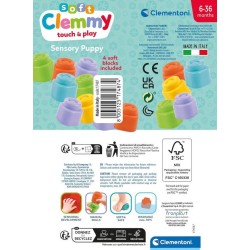 CLEMMY SENSORY PUPPY un pratico raccoglitore a forma di dolce volpe dalle diverse texture dove inserire i mattoncini morbidi per costruzioni brevettati da Clementoni per sviluppare manualità e fantasia in piena sicurezza
