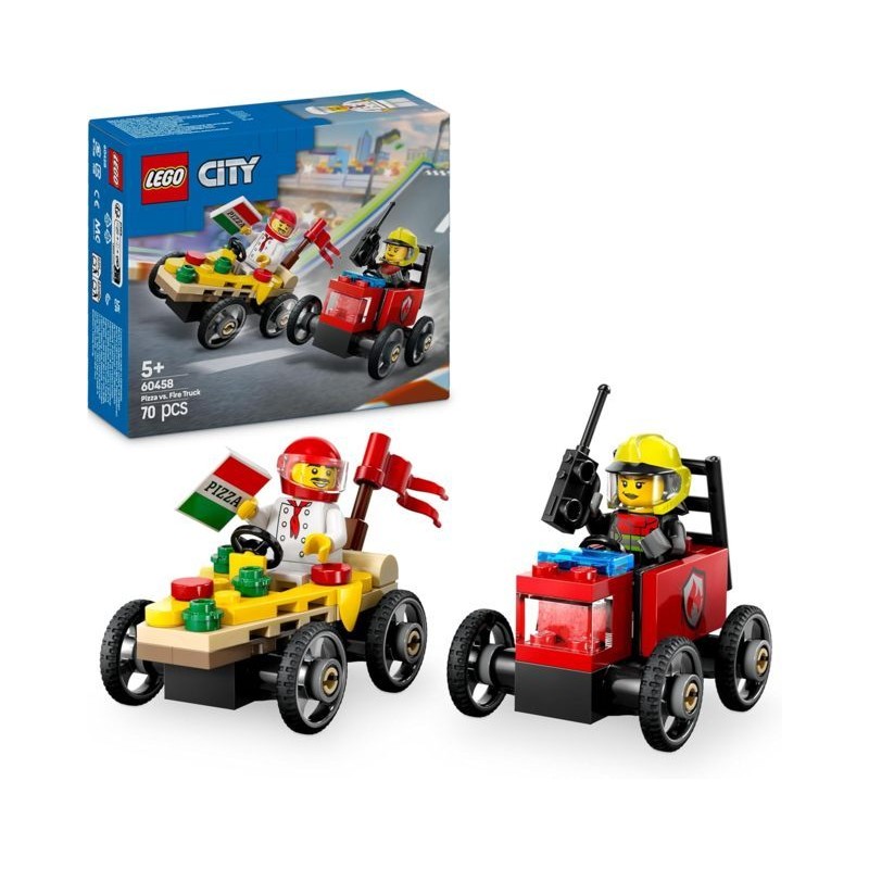 Set con auto da corsa LEGO City offri al tuo giovane pilota il Pack Veicoli da Corsa Pizzaiolo Contro Pompiere un divertente gioco con le costruzioni per bambini e bambine da 5 anni in su