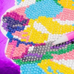 CONTENUTO il set contiene 1 quadretto di cm 21x29 5 con base adesiva e guida colore 3000 cristalli colorati 1 vassoio raccoglitore 1 penna con cui applicarli e 1 quadretto di cera