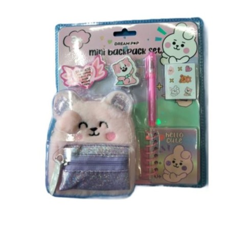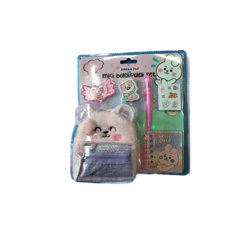 Il Mini backpack set Tri Coastal Coniglio contiene 1 portachiave a zainetto 1 penna 1 miniquaderno spirlato 1 gomma sagomata 1 foglietto di sticker