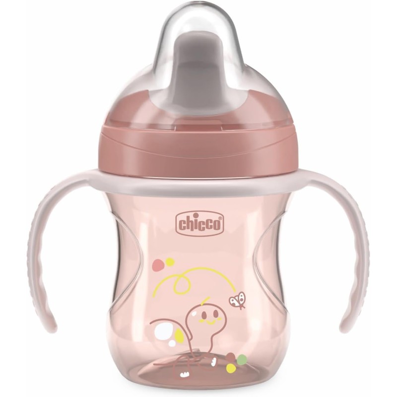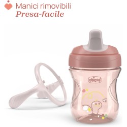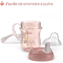 TAZZA ERGONOMICA la tazza ergonomica con manici rimovibili è facile da impugnare e ideale per insegnare ai bambini a bere da soli FORMA ERGONOMICA il beccuccio ergonomico semi morbido resiste ai morsi e la sua forma sagomata favorisce il corretto posizionamento delle labbra POSTURA ADATTATA Il posizionamento eccentrico del beccuccio della tazza vicino al bordo facilita la corretta posizione del collo durante il bere EASY SIPS CAP Il tappo Easy SIPS è un pezzo unico e rimovibile brevettato per garantire la tenuta della coppetta senza compromettere la facilità d uso per il bambino IMPARARE A BERE tazze Chicco sono stati progettati con logopedisti esperti per guidare naturalmente il bambino attraverso il passaggio dall allattamento al seno alla capacità di bere da solo