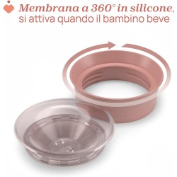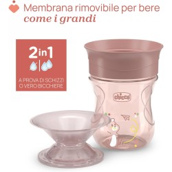 TAZZA A PROVA DI SCHIZZI La tazza ergonomica Chicco Perfect Cup con manici removibili è facile da impugnare ed è pensata per i bambini dai 12 mesi che stanno imparando a regolare il flusso durante la bevuta coordinando respirazione e deglutizione TAZZA A 360 La tazza consente di bere a 360 come dal bordo di un bicchiere in modo autonomo e senza rovesciare l acqua MEMBRANA IN SILICONE La sua superficie trasparente permette al bambino di vedere arrivare il liquido per essere pronto a riceverlo in bocca BICCHIERE PER BAMBINI La membrana può essere facilmente rimossa per trasformare la tazza in un bicchiere per bambini da utilizzare con o senza manici IMPARARE A BERE Le tazze Chicco sono state ideate con esperti logopedisti per guidare il bambino in modo semplice e naturale nel passaggio dall allattamento al bere in autonomia