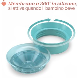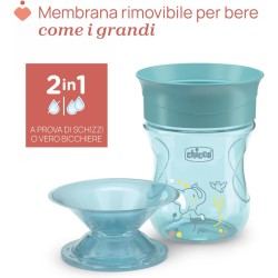 TAZZA A PROVA DI SCHIZZI La tazza ergonomica Chicco Perfect Cup con manici removibili è facile da impugnare ed è pensata per i bambini dai 12 mesi che stanno imparando a regolare il flusso durante la bevuta coordinando respirazione e deglutizione TAZZA A 360 La tazza consente di bere a 360 come dal bordo di un bicchiere in modo autonomo e senza rovesciare l acqua MEMBRANA IN SILICONE La sua superficie trasparente permette al bambino di vedere arrivare il liquido per essere pronto a riceverlo in bocca BICCHIERE PER BAMBINI La membrana può essere facilmente rimossa per trasformare la tazza in un bicchiere per bambini da utilizzare con o senza manici IMPARARE A BERE Le tazze Chicco sono state ideate con esperti logopedisti per guidare il bambino in modo semplice e naturale nel passaggio dall allattamento al bere in autonomia