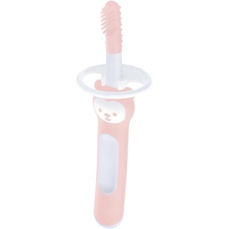 Confezione Mam massaging brush spazzolino per igiene orale bimbi 3 mesi 1 anello di protezione per la gola senza BPA e BPS istruzioni in italiano rosa