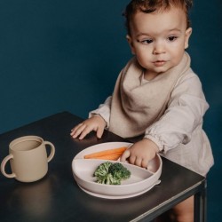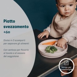 Questo prodotto è diviso in 3 scomparti per separare gli alimenti in base alle necessità ed è dotato di una ventosa nella parte inferiore per fissare il piatto al tavolo oppure al vassoio del seggiolone