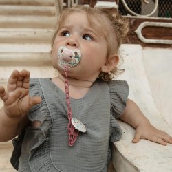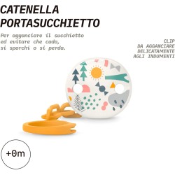 La catenella per ciuccio è dotata di una clip che permette di fissarla delicatamente ai vestiti del bambino per evitare che cada a terra si sporchi o si perda
