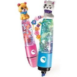 COSA CONTIENE gioco ideato progettato e sviluppato in Italia con 3 evidenziatori da decorare con tappi cappucci inchiostri decorazioni iridescenti perline cordini elastici e 3 personaggi diversi con manuale per guidare nella composizione