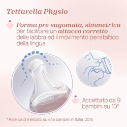 TETTARELLA PHYSIO SOFT SENSE con una forma simmetrica allungata e appiattita la tettarella Physio imita il capezzolo della mamma offrendo facilità di suzione e di accettazione da parte del bambino la speciale finitura Soft Sense rende la tettarella vellutata e soffice per una suzione ancora più naturale e confortevole