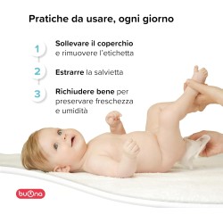 USO QUOTIDIANO PRATICO E VERSATILE Perfette per il cambio pannolino la pulizia del viso e delle mani e anche per adulti e viaggi Il pratico sistema di apertura preserva freschezza e umidità delle salviettine neonato dopo ogni utilizzo