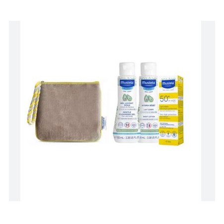 Tutto per la Pelle in Viaggio Il Kit Viaggio 2024 Mustela contenuto in una trousse di yuta include Hydra Bébé Latte Corpo Detergente Delicato e Latte Solare SPF50