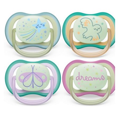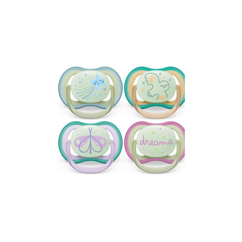 Traspirante fori d aria extra large permettono alla pelle di respirare Scudo leggero per tettarella il ciuccio AVENT molto leggero consente il massimo flusso d aria Ortodontico la tettarella simmetrica presta attenzione allo sviluppo dei denti del bambino Contenitore per il trasporto basta conservare e sterilizzare i ciucci nella scatola Accettazione del 98 della tettarella in media il 98 dei bambini ha accettato il ciuccio Ultra Air
