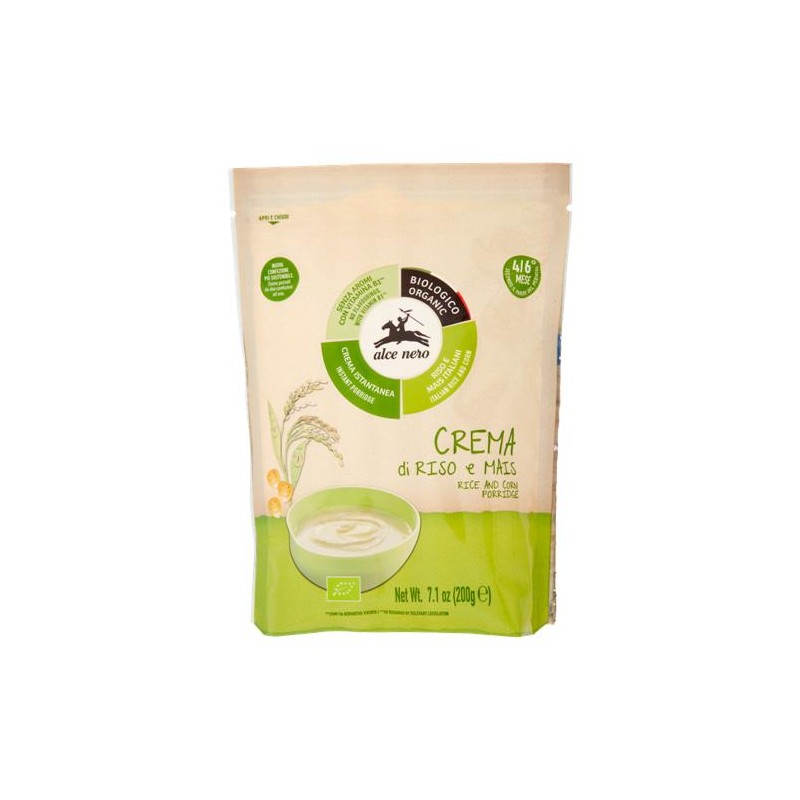 La crema di riso e mais babyfood biologica Alce Nero è preparata con riso biologico e italiano coltivato in Piemonte e Lombardia Non contiene aromi è istantanea ed è indicata dal 4 6 mese in poi E' senza glutine e con l aggiunta di vitamina B1 come da normativa vigente Anni di esperienza nel biologico e nella messa a punto di delicati processi di lavorazione ci permettono di ottenere una crema che nutre il bambino avvicinandolo al gusto dei cereali