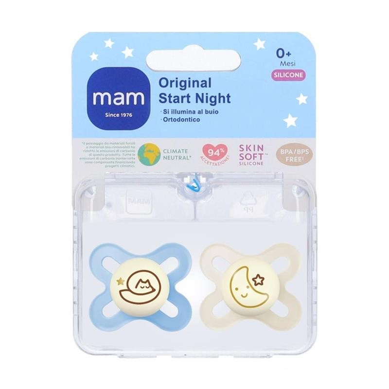 Contenuto della confezione MAM Original Start Night Set Neonato con 2 Succhietti 0 2 Mesi Ciucci MAM 0 2 mesi con tettarella simmetrica e sterilizzatore ciuccio portatile