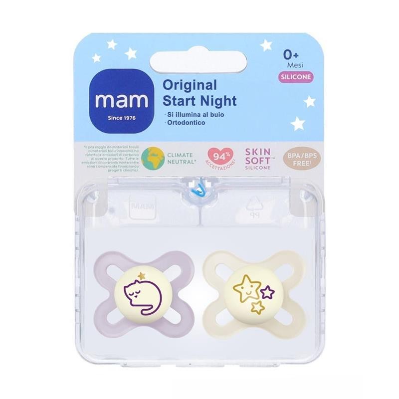 Contenuto della confezione MAM Original Start Night Set Neonato con 2 Succhietti 0 2 Mesi Ciucci MAM 0 2 mesi con tettarella simmetrica e sterilizzatore ciuccio portatile