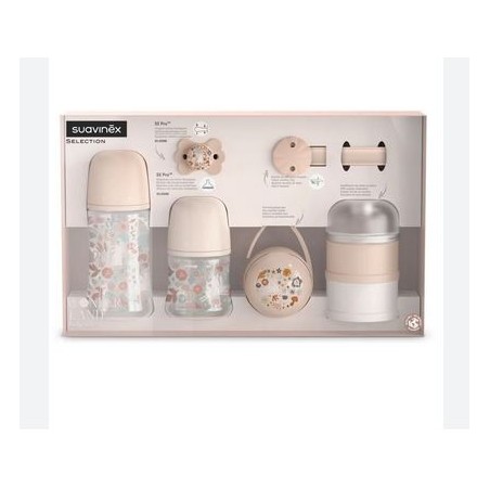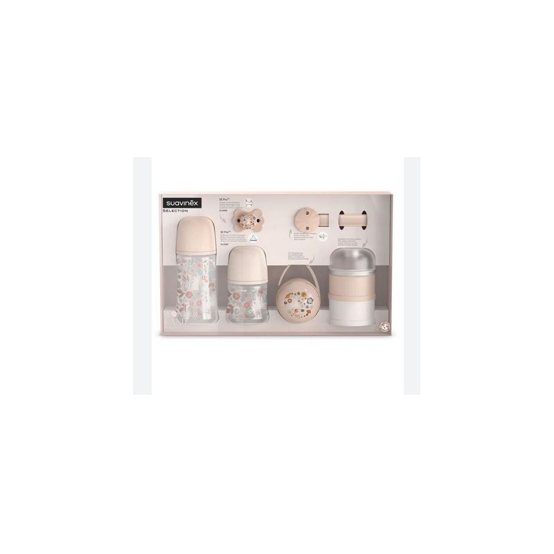 Il set contiene 1 biberon con tettarella flusso lento 1 biberon con tettarella flusso medio 1 succhietto 1 catenella portaciuccio 1 scatola portaciuccio e 1 dosatore di latte in polvere