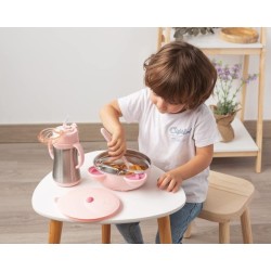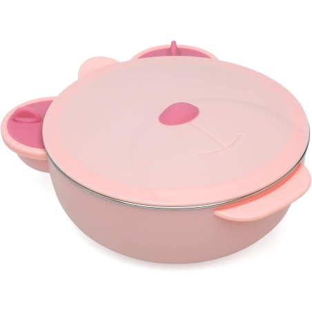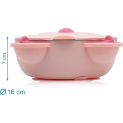 L interno è in acciaio inox ottimo per il contatto con gli alimenti e grazie alla sua ventosa anti ribaltamento rimane fisso su un tavolo o un seggiolone perfetto per chi inizia a mangiare da solo