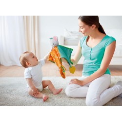 IMPARARE GIOCANDO grazie ai nastri ai nodini e alle diverse texture tattili questo comforter stimola i sensi in modo naturale favorendo lo sviluppo del tatto e offrendo un supporto mordicchiabile sicuro durante la fase della dentizione