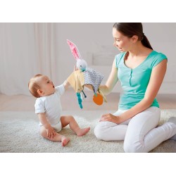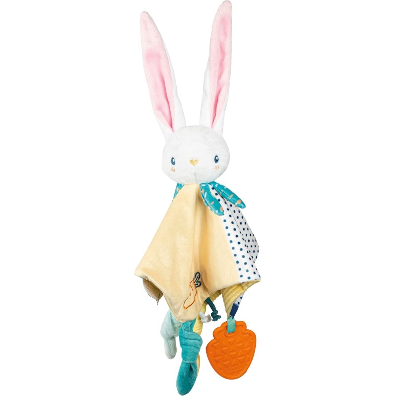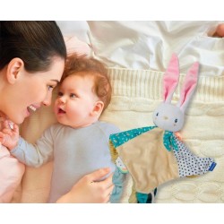 COME GIOCARE il coniglietto può essere utilizzato come marionetta da dita per interagire con il piccolo il comforter doudou è un compagno di nanna personalizzabile con il nome del bambino il massaggiagengive integrato favorisce la dentizione in totale sicurezza