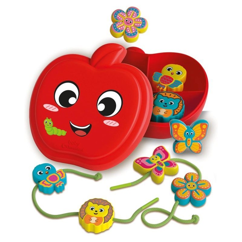 HAPPY APPLE FRIENDS un set di attività coinvolgente ispirato al metodo Montessori con 8 personaggi colorati da infilare e sfilare tramite un laccio ideale per stimolare la manualità fine e la precisione dei movimenti dei più piccoli fin dai 18 mesi
