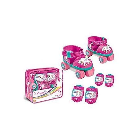 Set completo il pacchetto comprende i pattini e tutte le protezioni per mettere al sicuro la vostra bambina gomitiere ginocchiere e la borsa trarente perfetta per trasportare il tutto comodamente casco non presente