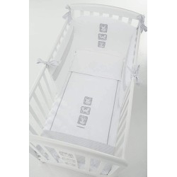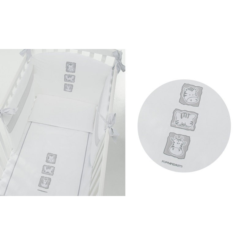 Il completo piumone Babyzoo di Foppapedretti è caratterizzato da ricami con i simpatici animali della savana che contraddistinguono la collezione nelle tinte del grigio Il set tessile è composto da