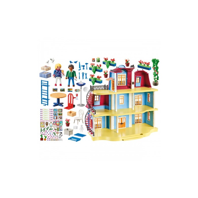 La grande casa delle bambole di playmobil è un sogno per qualsiasi bambina In questa romantico edificio tutti gli abitanti si sentono proprio a casa Ci si può sbizzarrire in mille modi per arredare e decorare le numerose stanze ziose sui due piani e l attico Qualcuno ha suonato il campanello è papà che porta un altro paio di scatole per completare il trasloco Incredibile è già arrivata la posta al nuovo indirizzo nel frattempo la mamma si gode la meravigliosa vista dalla terrazza sul tetto Che casa meravigliosa che hanno il play set comprende due personaggi playmobil una casa con sei stanze e una terrazza sul tetto a cui si accede tramite una scala a chioccola esterna un campanello funzionante una cassetta delle lettere apribile e tanti altri accessori Include adesivi con numeri e nomi per la porta d ingresso oltre a tanti altri adesivi per decorare le pareti Il play set è ottimo da arredare con le sei accoglienti stanze dei play set 70206 70207 70208 70209 70210 e 70211