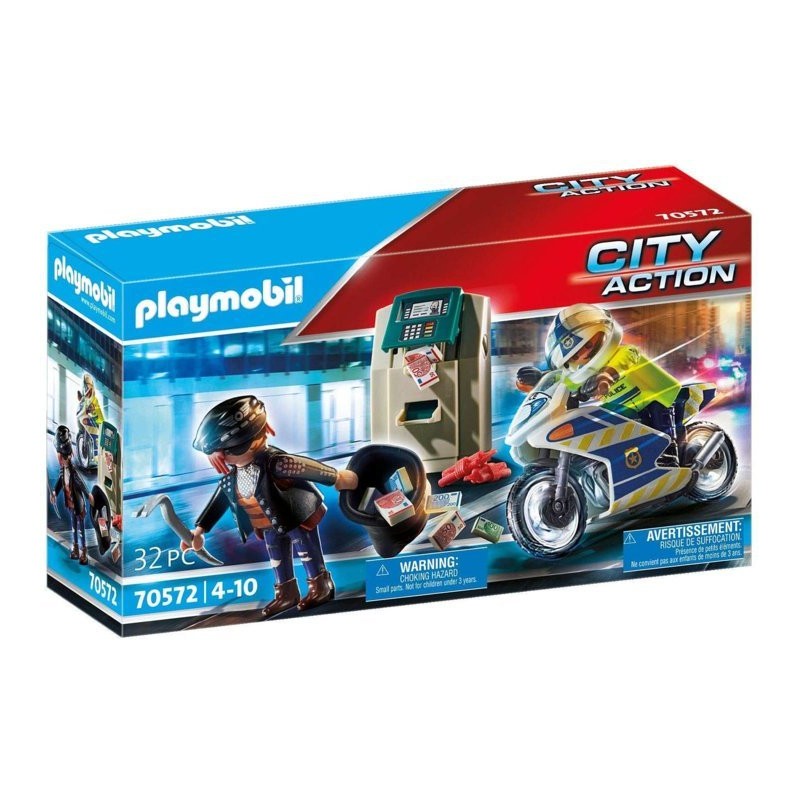 Sfruttando il buio della notte un ladro ha scassinato un bancomat ed è ora in fuga con il bottino Il poliziotto in sella alla sua moto lo insegue a tuto gas Per il ladro non c è scampo Il set include due personaggi PLAYMOBIL una moto un bancomat un sacco per la refurtiva le banconote e molto altro