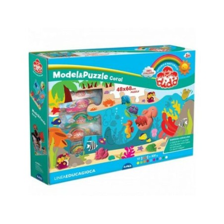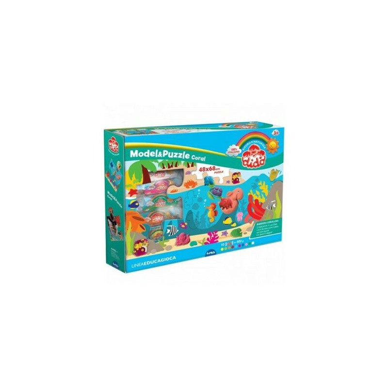 La confezione contiene 35 grandi tessere su cui comporre lo scenario per poi giocare a sovrapporre nei tracciati predisposti i simpatici amici marini da modellare grazie all utilizzo delle formine