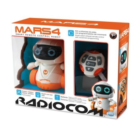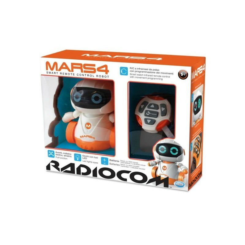Radiocomando mars 4 robot con funzioni radiocomando a infrarossi a forma di orologio Gioca con il tuo robot con gli occhi con luci LED e fallo muovere avanti indietro a destra e a sinistra e usa il suo rc a infrarossi da polso per la programmazione dei movimenti Batteria per radiocomando 1 x cr2032 inclusa Batteria per robot 4 x ag13 inclusa