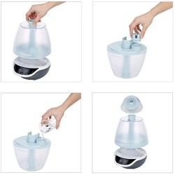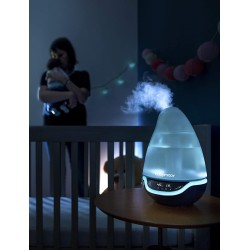 L umidificatore Hygro Babymoov silenzioso e di design vi consente di verificare l atmosfera della camera del vostro bambino e assicurargli un aria sana durante il sonno Potete regolare manualmente o automaticamente il tasso di umidità e seguire la sua evoluzione nonché verificare la temperatura della camera sullo schermo tattile retroilluminato Anche la luce notturna multicolore si comanda tramite lo schermo Pratico è anche dotato di un diffusore di oli essenziali Con una lunghissima autonomia fino a 22 ore Hygro è adatto per una stanza fino a 20 m