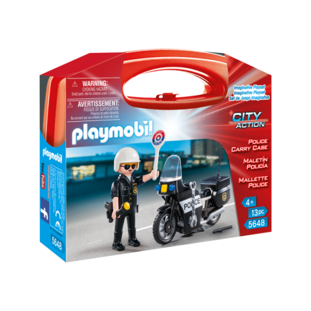Indicato da 4 anni in su Valigetta della Polizia con moto e personaggio Il poliziotto è dotato di casco manette torcia manganello e pistola Pratica valigetta per il trasporto e per riporre tutto all interno alla fine del gioco Set della linea Carry