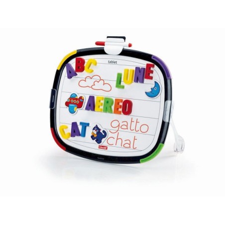 La lavagna permette di attaccare gli elementi calamitati a forma di lettere su entrambi i lati bianco e nero e di scrivere o disegnare con i pennarelli a secco cancellabili