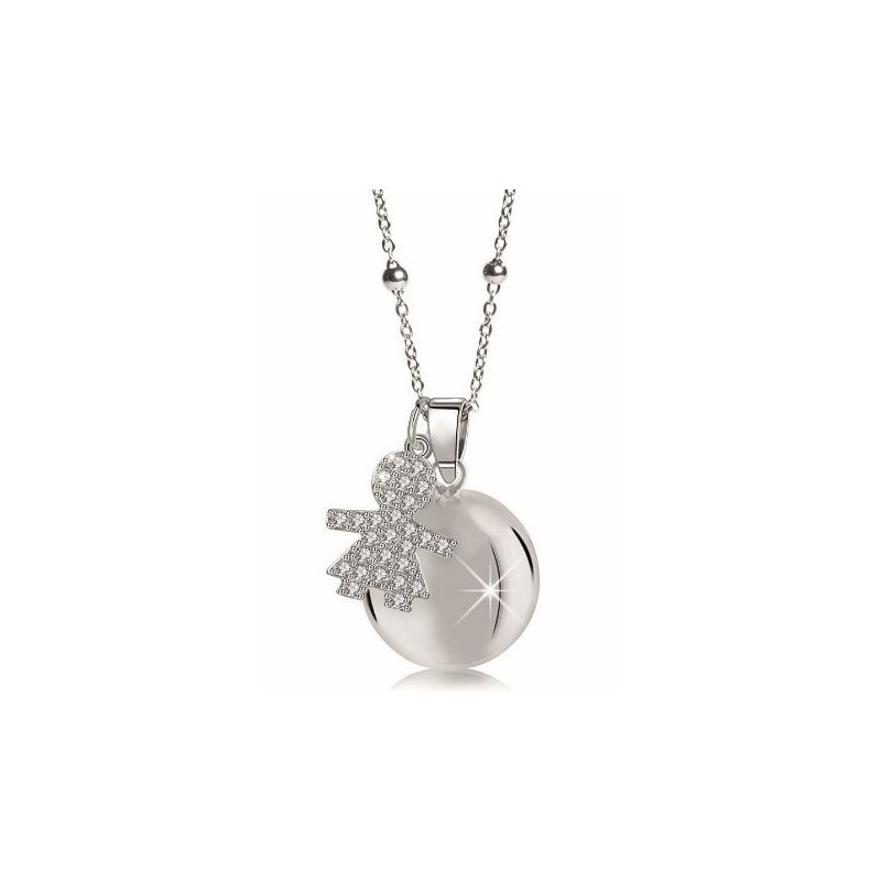 Un ciondolo musicale in rame soffiato d argento Il ciondolo a forma di palla con un diametro di 20 mm ha un mini xilofono all interno che produce un suono unico ad ogni movimento Il suono può essere sentito dal bambino dalla 20a settimana di gravidanza e gli rimarrà familiare dopo la nascita dandogli la stessa sensazione di familiare sicurezza dal grembo materno Il ciondolo simbolico ha la forma di un bambino ricoperto di ciottoli se lo si desidera può essere rimosso con una pinza Una catena regolabile La catena è realizzata in rame soffiato argento Ha una lunghezza di 110 cm in modo che possa raggiungere la pancia della donna incinta Per il periodo post gravidanza la catena può essere regolata alla lunghezza desiderata