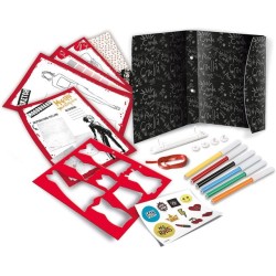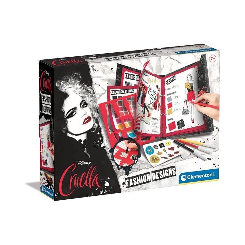 Contiene un lookbook da assemblare e decorare con tante pagine pennarelli colorati e sticker per personalizzare gli outfit della collezione moda di Cruella