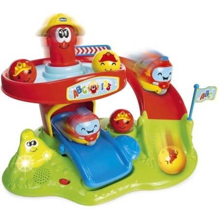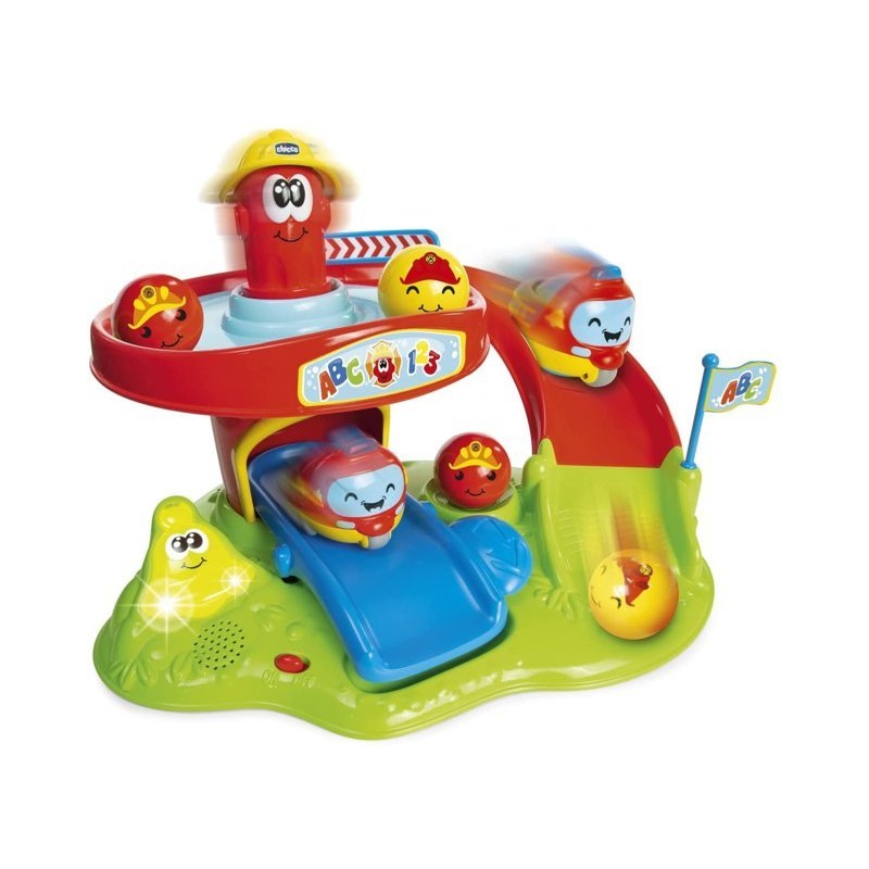 CENTRO ATTIVITA' ELETTRONICO La Caserma dei Pompieri Chicco è un divertente centro attività elettronico parlante pensato per giocare con i mini veicoli e le palline Turbo Ball include il Camion dei Pompieri e 2 palline tematizzate