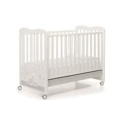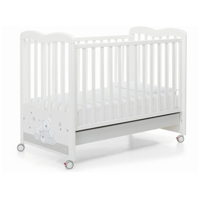 Lettino con sponda regolabile a doppia altezza posizionabile a destra o a sinistra rende facile il riordino del lettino Testata decorata con teneri orsetti e stelline Dotato di 4 ruote gommate piroettanti di cui 2 con freno che rendono agevole lo spostamento Rete a doghe il legno massiccio di faggio regolabile a due altezze e ampio cassetto Struttura in legno massiccio di faggio verniciato con colori atossici testato a Normativa Europea