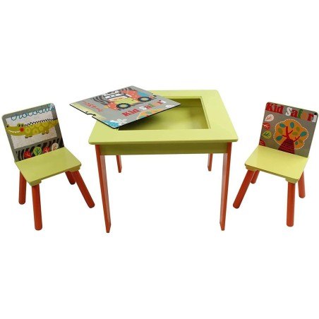 Set arredo cameretta composto da tavolino double face con lavagna incorporata e due sedie abbinate Il set è fatto in legno di alta qualità decorato a tema giungla