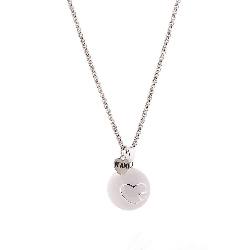 Ogni scatolina contiene 1 ciondolo chiama angeli diametro 20mm smaltato bianco con due CUORI 1 ciondolo a forma cuore con inciso il marchio M AMI 1 elegante catenina in acciaio 110 cm