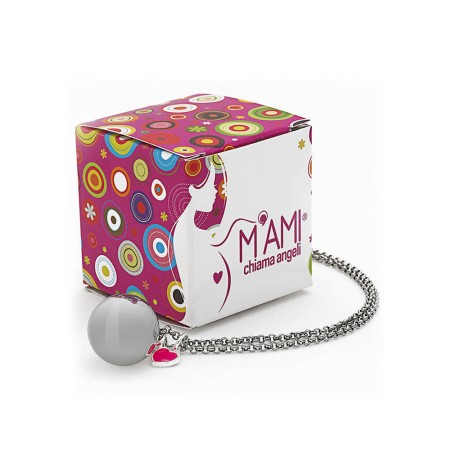 Ogni scatolina contiene 1 ciondolo chiama angeli costituito da una gabbia a forma di cuore traforata in rame con bagno galvanico in argentato e pallina bianca interna 1 ciondolo a forma di cuore con inciso il marchio M AMI in rame con bagno galvanico in argentato 1 elegante catenina in acciaio 110 cm cad