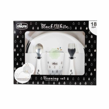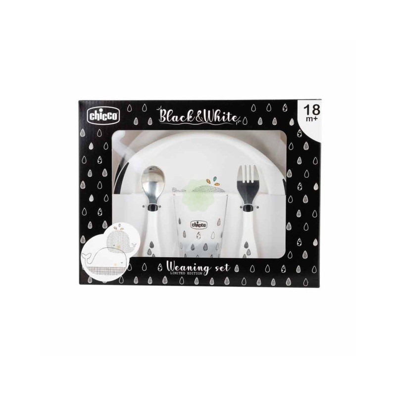 Chicco Set Pappa Limited Edition Black White 18M Balene è ideale per imparare a mangiare e bere con stile Comprende elegante ciotola con base antiscivolo piatto piano bicchiere e posate in acciaio inox studiati per i bimbi