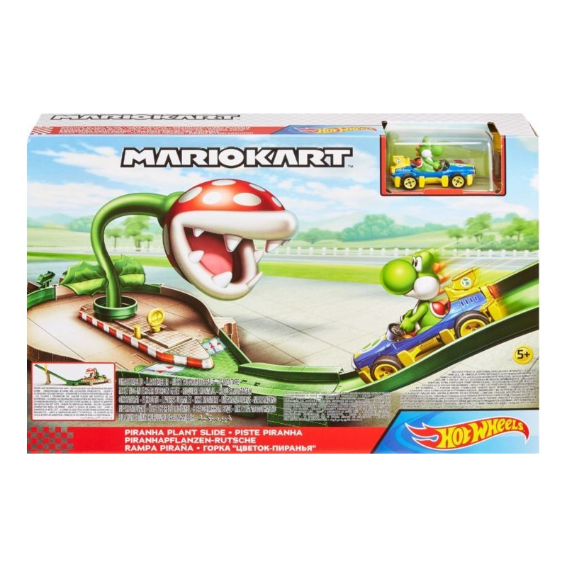 Hot Wheels porta in vita l azione frenetica del mondo di Mario Kart con un Circuit Track ispirato ai percorsi iconici del popolare videogioco Gareggia con il Mario Kart Mario preferito nei panni di un veicolo kart pressofuso e supera ostacoli e sfide proprio come nel gioco ma questa volta sulla pista Hot Wheels Carica il kart nel lanciatore e parti per la pista
