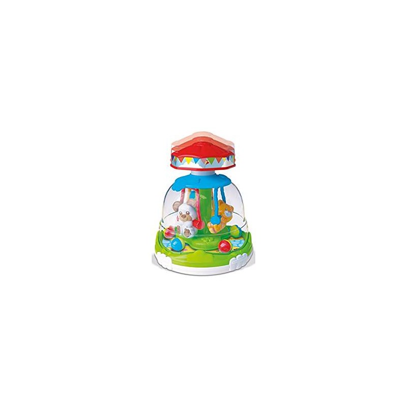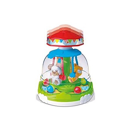 Premendo il pulsante di questa simpatica trottola gli animaletti sulle altalene iniziano a girare come in una vera giostra e fanno muovere le palline facendo divertire il bambino