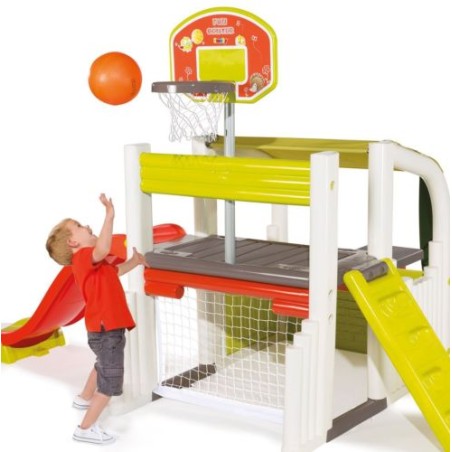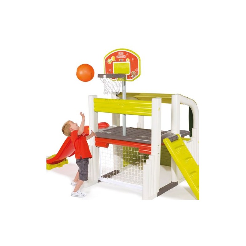 Fun Center è davvero un centro gioco unico i bambini e le bambine si divertiranno nelle molte attività sportive e gioco che il Fun center include una porta calcio un canestro regolabile in altezza una scaletta arrampicata una piattaforma su cui sostare uno scivolo un tavolino completo di sedie posizionabile sia esternamente sia internamente sotto la veranda da cui il bambino potrà entrare ed uscire grazie ad una porticina e in cui potrà ripararsi dal sole grazie alla tendina in tessuto comodamente applicabile in due posizioni completamente o a metà la palla è inclusa i colori sono unisex e la loro brillantezza nel tempo sarà mantenuta grazie al trattamento anti uv è adatto a bambini di età superiore ai 2 anni montato misura 284 203 176 è prodotto in Francia
