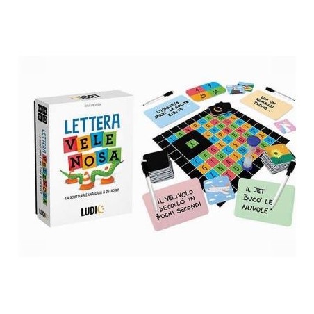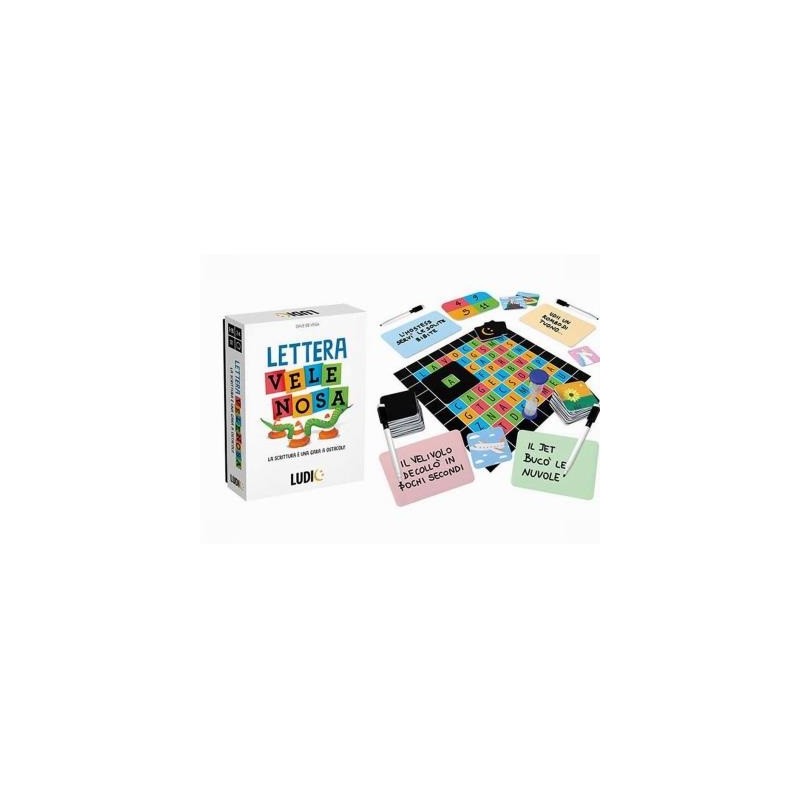 Età 8 99 La scrittura è una gara ostacoli Hai mai provato a scrivere una frase evitando la lettera A Un originale party game che allena le tue capacità di scrittura creativa ma attenzione non devi usare la lettera velenosa Scrittura creativa Strategia 40 cartine soggetto 1 plancia delle lettere 1 clessidra 1 segna lettera 4 lavagnette 4 pennarelli cancellabili 1 scheda segnapunti Regolamento Made in Italy