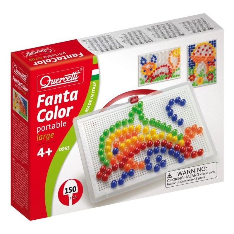 Contiene 150 chiodini diametro 15 in 5 colori 1 tavoletta traforata 1 comodo cestello con maniglia 1 album di esempi