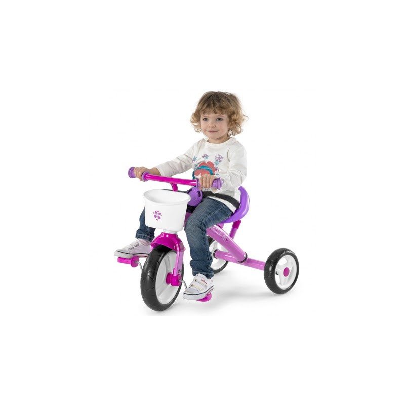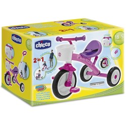 Triciclo dal design sportivo e moderno Prevede 2 modalità d uso spingi e vai il manico telescopico può essere regolato in funzione dell altezza dell adulto facilitando la spinta e la guida del bambino Pedalata libera rimuovendo il manico il bambino può pedalare liberamente Blocco guida e ruota libera con sistema on off Con cintura di sicurezza e cestello anteriore