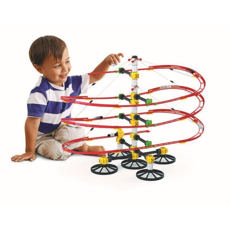 Tutto il necessario per costruire una pista sospesa per le biglie che può raggiungere i 5 metri di spettacolare sviluppo aereo