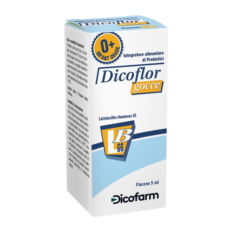 Dicoflor gocce è un integratore alimentare di probiotici ideale per ripristinare e mantenere l equilibrio della flora batterica nei neonati Indicazioni Dicoflor gocce per neonati è formulato con Lactobacillus rhamnosus GG ATCC 53103 Può essere usato durante la terapia antibiotica e per ristabilire l equilibrio della flora batterica intestinale in caso di diarrea In particolare le condizioni in cui può essere utile l assunzione dei fermenti lattici Dicoflor sono diarrea o stitichezza gonfiore e tensione addominale durante la terapia antibiotica